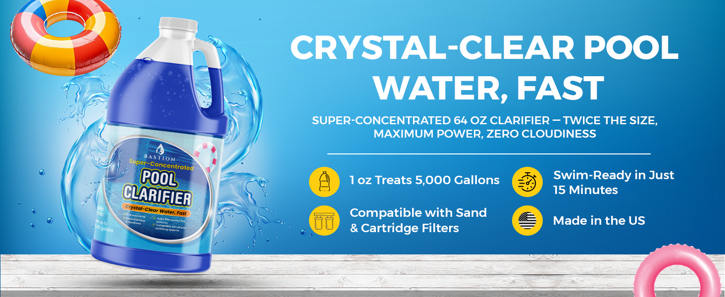 - Crystal Clear Water, Fast – Quickly transforms dull, cloudy pool water into crystal-clear brilliance. Bastion’s advanced clarifier binds tiny, invisible particles into larger clusters, allowing your filter to trap and remove them easily. Enjoy visibly clearer, cleaner water in just hours with professional-grade results that speak for themselves—perfect for both regular maintenance and emergency cleanup.