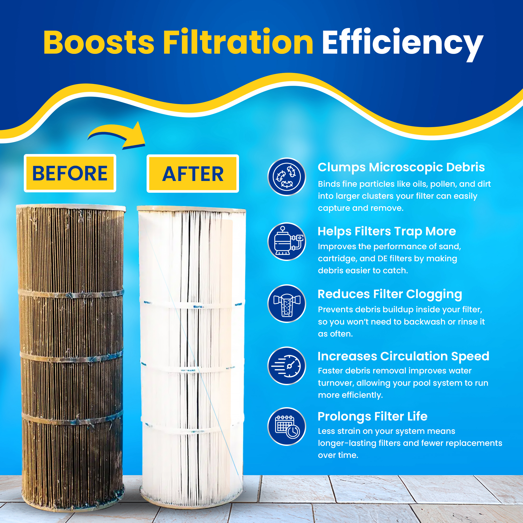 - Improves Filter Efficiency – Bastion doesn’t just clarify water—it helps your filter work smarter. By coagulating microscopic debris, it allows sand and cartridge filters to trap contaminants more effectively. The result? Improved filtration, reduced pressure on your system, and fewer backwashes or cleanings needed. It’s a proactive way to maintain your equipment and extend filter life.